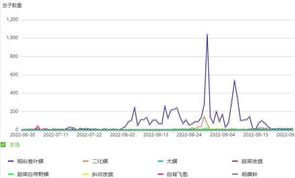 今年8月末,受臺風(fēng)“軒嵐諾”影響,杭州市余杭區(qū)出現(xiàn)持續(xù)大風(fēng)和高濕天氣,托普云農(nóng)智能蟲情測報燈有效監(jiān)測到稻縱卷葉螟及二化螟蛾峰。